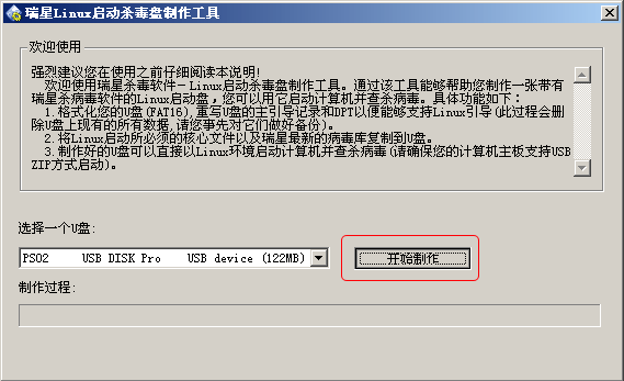 重要聲明:此工具在制作過程中將徹底清除USB盤中的原有數據,請您確認在開始制作瑞星引導殺毒U盤之前您已經對USB盤中的所有數據進行了有效備份!