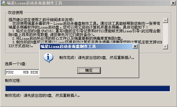 步驟6:當整個制作過程完成您將看到如下圖的提示,點擊“確定”按鈕結束制作過程。至此您的U盤已經制作為瑞星引導殺毒U盤,您可以使用該盤來引導計算機進行查殺病毒操作了。