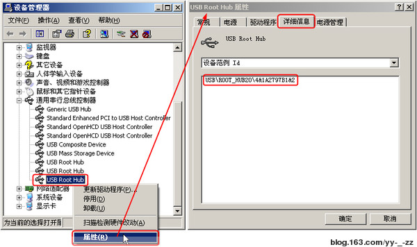 注解:上面代碼就是先實(shí)現(xiàn)停用USB設(shè)備再啟用。后面那一長串東西需要你自己修改,方法是在“USB Root Hub”上右擊選擇“屬性”,再選擇“詳細(xì)信息”,用“設(shè)備范例ID”替換掉上面代碼中的即可。最后要注意的是,“@”和雙引號,這可是成敗的關(guān)鍵!