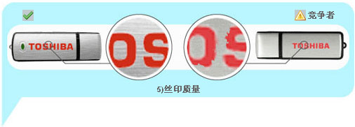 U盤磨損是難免的,但Chenge Tech盡一切所能保證我們所印的產品擁有最持久的耐用性.針對金屬外殼,在產品裝配前,絲印之后我們會用烤箱來使絲印的產品性能更堅韌更耐久.我們嚴格按照質量管理程序來操作,保證我們所印的每個logo都是100%正確統一的.上面的圖象是經過一個標準質量管理刮痕硬度試驗后的結果.競爭者所印的產品很容易剝落而Chenge Tech所印的產品卻能保持原樣.