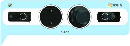PCB是您看到的多數電子產品內綠色的那個電路板零件.我們貼的PCB在4個地方緊緊地固定了它的位置.不幸地是,有些差勁的生產商竟然是用從一支膠水槍中噴出的熱膠漿將PCB膠合在上面的.當U盤加熱時,膠漿變得更不穩定,PCB也隨后開始擺動.