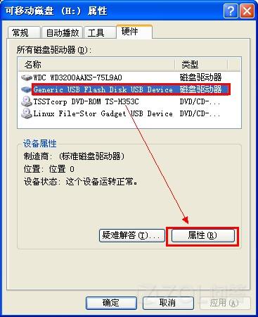 2 在所有磁盤驅動器列表中選擇名稱含有USB的磁盤驅動器,單擊右下方的“屬性”按鈕