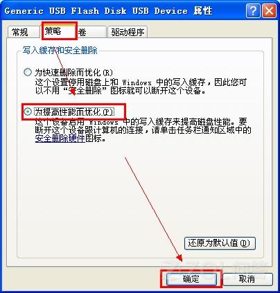 3 在打開的窗口點擊“策略“選項卡。將策略改為“為提高性能而優化”。確定即可解決被寫保護的問題。