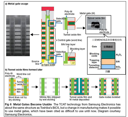 不過,各家廠商實現垂直型晶體管結構的方法則各有不同。東芝和三星較為傾向于采用電荷捕獲型柵極結構的垂直型晶體管;Hynix則傾向于采用傳統浮柵柵極結構的垂直型晶體管。而且,在柵極制作工藝方面,也分為Gate-last和Gate-first兩種工藝流派。