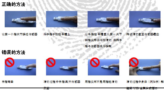 無論指紋驗證或注冊,都需要使用者采集到質量好的指紋!正確的滑動手指,以獲得高質量的指紋,是識別成功率的根本保證。請參考以下提示: